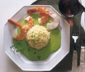 Die Soße in die Mitte der Teller geben, darauf das Sauerkraut. Die Hummerkrabben rund herum anrichten und mit etwas Kerbel dekorieren.