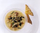 In der restlichen Butter die geschnittenen Frühlingszwiebeln dünsten und in der Mehlschwitze zusammen mit dem Sauerkraut etwa 6 Minuten köcheln lassen. Verfeinern mit Eigelb und Creme Fraiche. Mit Salz , Pffer und Zitronensaft und dem Weißwein würzen. Kurz vor dem Servieren Toasbrot in Viertelecken schneiden, mit Emmentaler bestreuen und kurz unter den Grill schieben. Emmentaler Croutons mit der Suppe servieren.